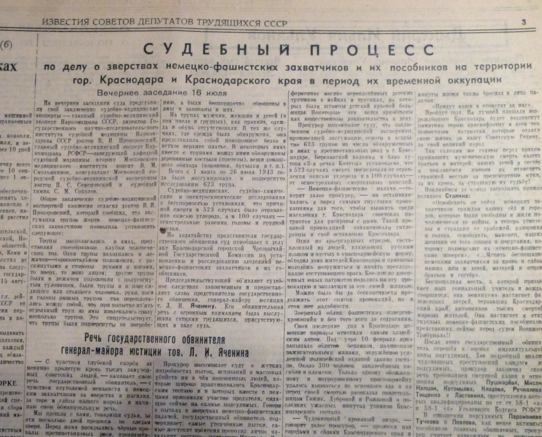 Первый в СССР открытый судебный процесс над пособниками немецких оккупантов состоялся в 1943 году в Краснодаре. В нем принимала участие первый Председатель Антифашистского комитета советских женщин, легендарная летчица, Герой Советского Союза Валентина Гризодубова. Она входила в Чрезвычайную государственную комиссию по установлению и расследованию злодеяний немецко-фашистских захватчиков, их сообщников, и причиненного ими ущерба гражданам, колхозам, общественным организациям, государственным предприятиям и учреждениям СССР.